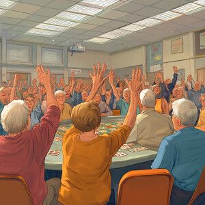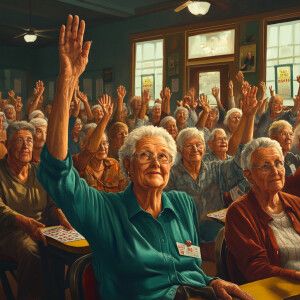 «A realistic picture of a crowd playing bingo at a senior center...»