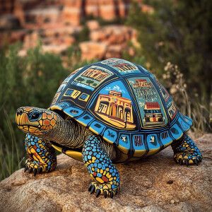 «A single tortoise with a travel destination pop art style shell...»