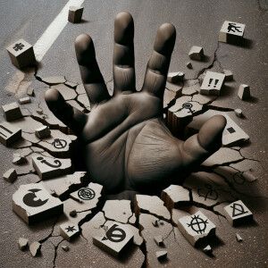 «A colossal, weathered hand with dark skin tone, bursting through...»
