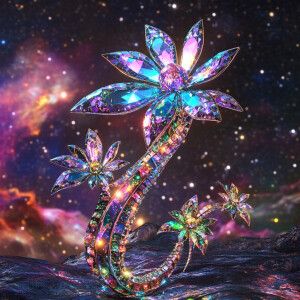 «A shimmering metallic alien made with intricate crystal flowers...»