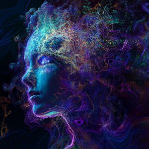 «Create an image of a bioluminescent, Aries-themed female figure...»