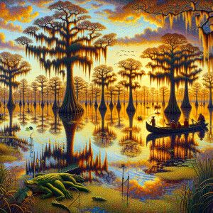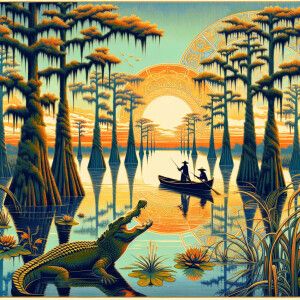 «Visualize a scene reminiscent of the lush swamps of Louisiana as...»