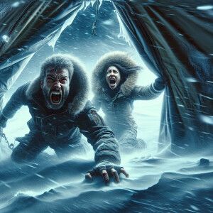«A man and woman desperately cut a gash in a scientific tent lett...»