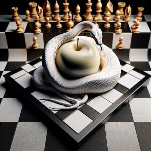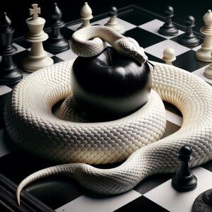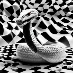 «Albino cobra wrapped around a black and white stripped apple, n...»