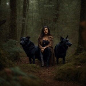 «A small dog, brown, hunting a flying, black crow in the forest»