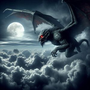 «A massive gargoyle with glowing red eyes soaring through the sky...»