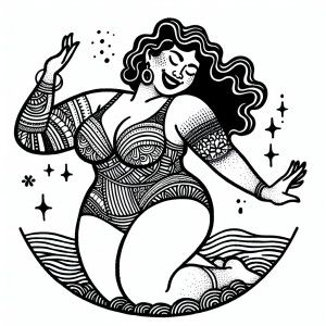 «image for a coloring page: a curvy women in bikini embracing her...»