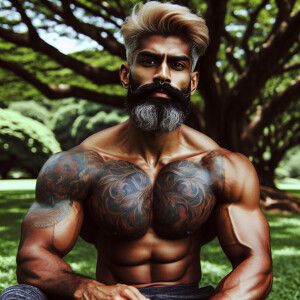«a powerful and self-assured bodybuilder sporting a striking ging...»
