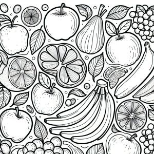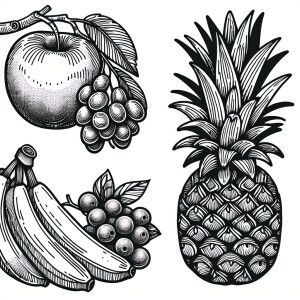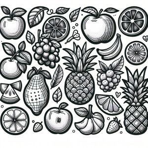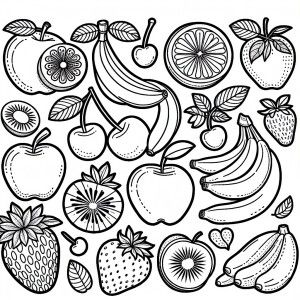 «Design a set of coloring pages presenting a variety of fruits, e...»