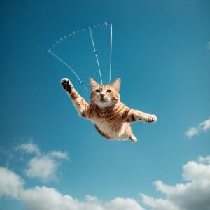 «A cat parachuting down from a clear blue sky, with its paws spre...»