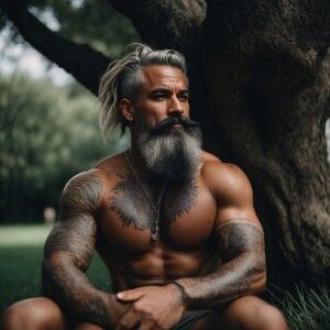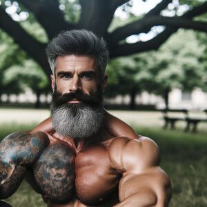 «a powerful and self-assured bodybuilder sporting a striking gray...»