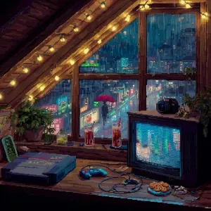 «A cozy attic room at night during heavy rain, viewed from inside...»