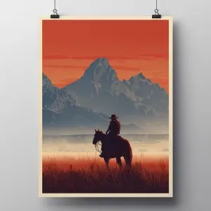 «Cinematic western poster style. A lone cowboy on horseback rides...»