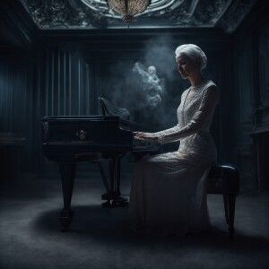 «Ghostly skeletal woman figure, aged 125, wrinkled skin, wispy wh...»