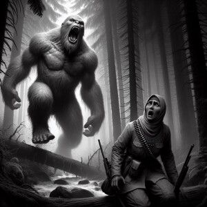 «A humanoid sasquatch screaming at a hunter in the woods»