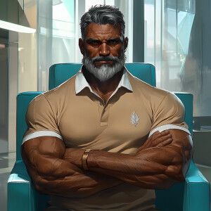 «The image shows a bearded brown, gray haired muscular man with a...»