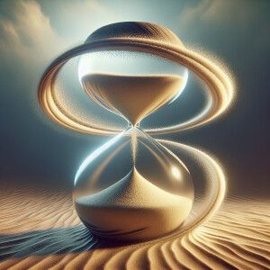 «Bending time through an hourglass touching a rocket ship»