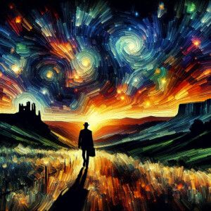 «Silhouetted of a man against an array of dynamic, walking down t...»