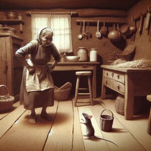 «A whimsical look of an elderly woman wearing an apron standing o...»