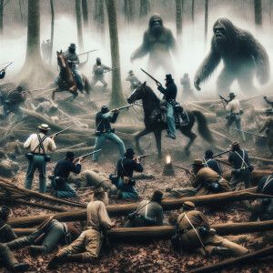 «A civil war scene with the north and south fighting and a few hu...»