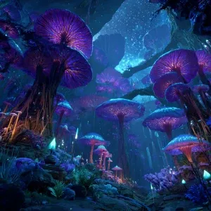 «A wide cinematic view of a colossal bioluminescent alien forest...»