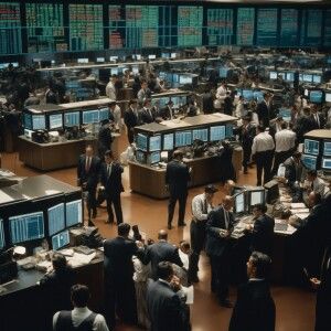 «“A fast-paced trading floor with traders in business attire, tal...»