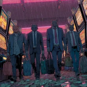 «Humanoid gangster cats sprinting through a neon-lit alley at nig...»