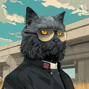 «A humanoid cat character with slicked-back dark hair, wearing a...»