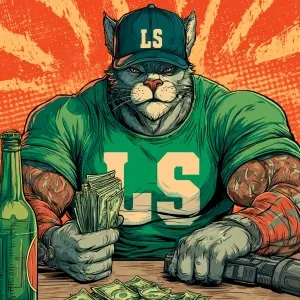 «A humanoid cat character with a muscular build, wearing a green...»