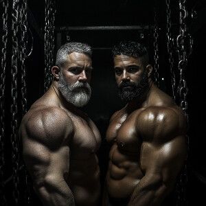 «Two bodybuilders, both gay men, one with gray hair and the other...»