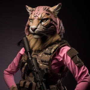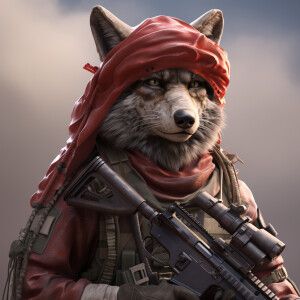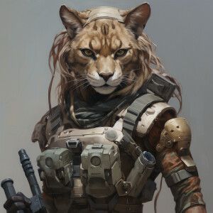 «A female, anthromorphic Florida red wolf, wearing military gear,...»