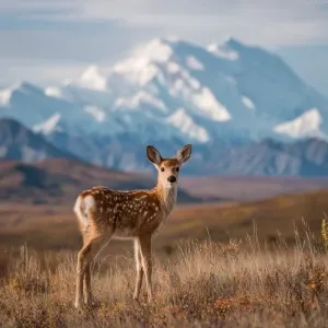 «Freckles the baby fawn stands in the vast tundra meadow with Mou...»