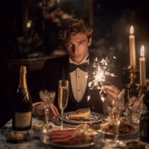 «A elegant man sitting at a beautifully arranged New Year's dinne...»