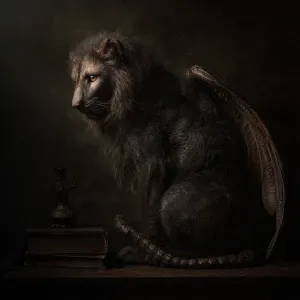«In the dimly lit room, a vintage-chic manticore emerges from the...»