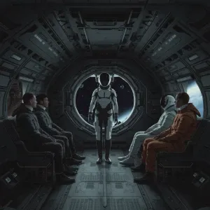 «In a futuristic realistic art style, inside the dark vast transp...»