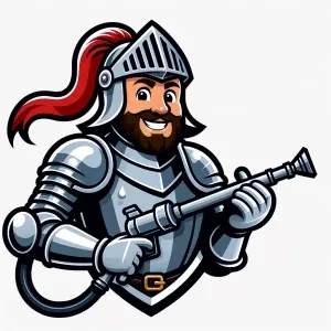 «a cartoonish knight mascot holding a pressure washing gun.»