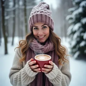 «A woman dressed in a cozy winter outfit, standing among snow-cov...»