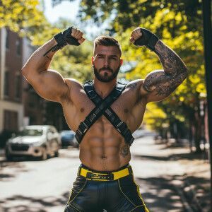 «In this image, a muscular man is posing on an outdoor street, fl...»