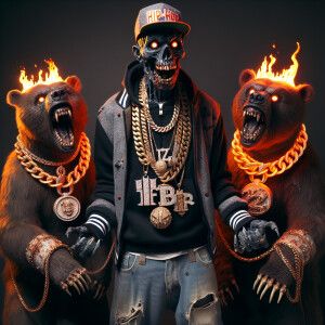 «Zombie dressed in hip-hop clothing and jewelry with on his right...»