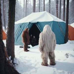 «Scene inside of winter tent camp. Nine people are loving in tent...»