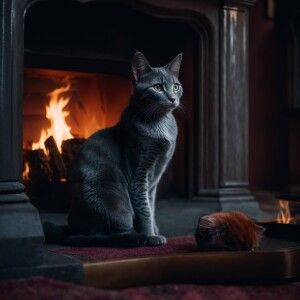 «Russian Blue cat sitting in front of a fireplace in a castle at...»