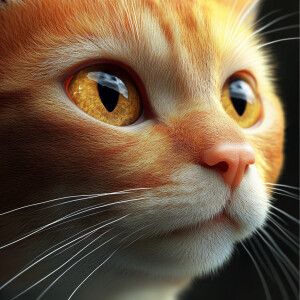 «Calico cat, long-haired, green eyes, black fur around right eye,...»