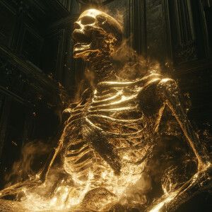 «Amidst swirling shadows and shimmering light, a figure emerges e...»