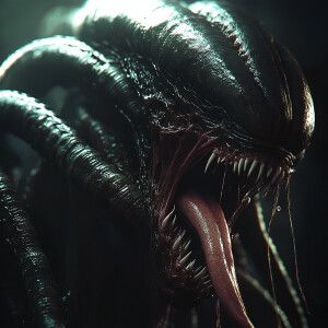 «A chilling dark fantasy scene depicting a highly detailed alien...»