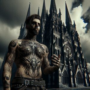 «Black Headed Gothic Man with Tattoos with a Cathedral in the bac...»