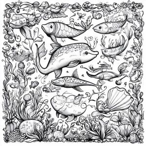 «coloring book page::A whimsical pattern of mermaids and sea crea...»