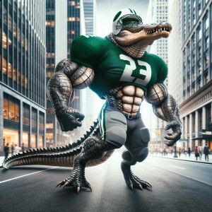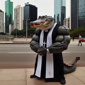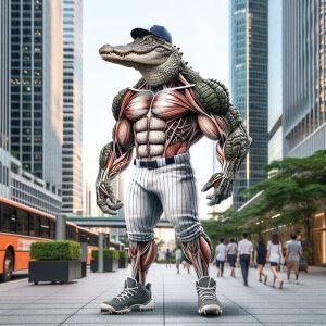 «Man- alligator hybrid with extra huge muscles with veins popping...»