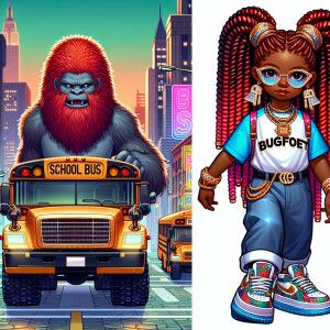«Illustrate a chic, Chibi-style school bus driver, a melanin woma...»