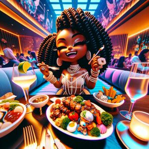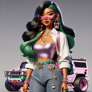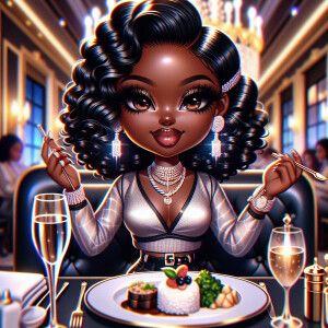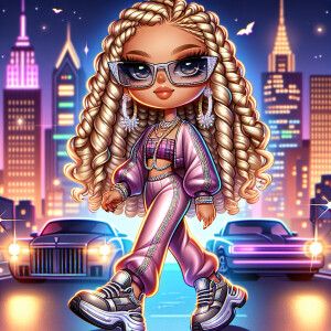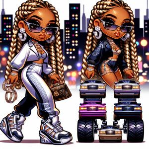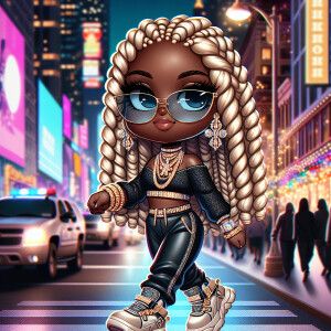 «A chic, Chibi-style melanin woman with glossy curls, strolling t...»