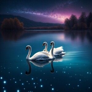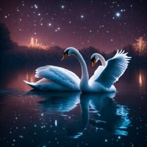 «Two shiny swans gracefully glide through the cold night on a shi...»